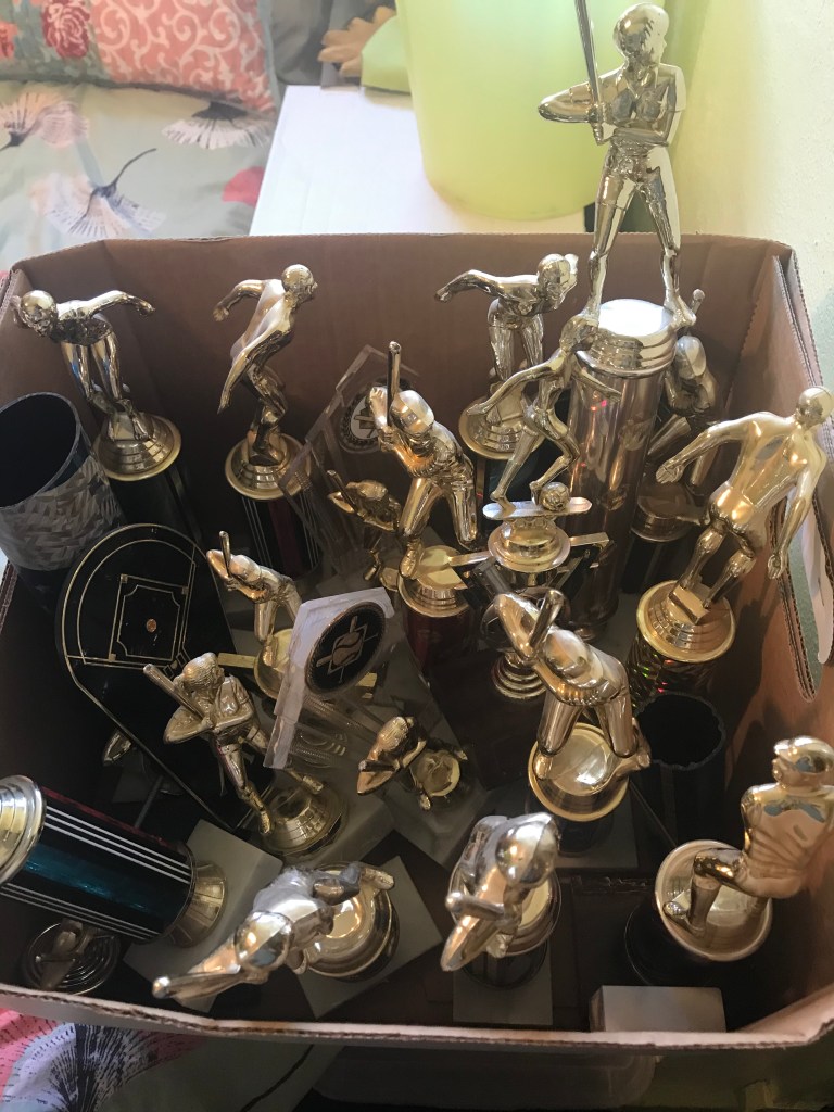 To actually decommission these objects, I carefully pried the nameplates off with a steak knife, only once stabbing my hand in the process. The nameplates now nestle in the photo album next to that year’s team sports photo. Two trophies were special enough that I determined a way to downsize them by removing the ostentatious center support and reattaching the figure at the top to the marble base, but those were unique and special, as they should be.
