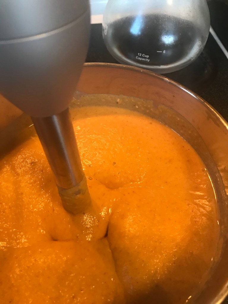 Stir together but at this point you’re really ready for the immersion blender. Like this one. Be sure you position the cord so it doesn’t cross the burner on the stove. You might want to remove from the burner to a safer location, blend it until smooth, and then return to the heat.